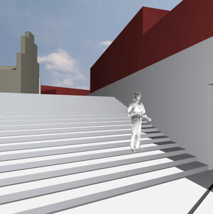 Passando all’analisi dell’altra porzione di piazza ci si rende subito conto che la chiesa di San Leone si trova in una situazione anomala provocata, nel corso degli anni, prima dal piano di livellamento di via Etnea e successivamente dal piano di risanamento di San Berillo e necessita di un reinserimento nel tessuto dal quale risulta completamente slegata. Quindi l’intenzione progettuale è quella di ricreare, alla quota originaria, il sagrato che riesce a dialogare e a tessere nuove relazioni, grazie alle soluzioni d’angolo che lo caratterizzano: ad ovest l’ampia scalinata che conduce al sagrato e che è accessibile sia dalla piazza che da via Montesano; a sud, all’incrocio tra via Montesano e via Piccini, lo spigolo a sbalzo sostenuto da un unico pilone che assolve anche alla funzione di perno della rotatoria della pista ciclabile prevista dall’ammistrazione comunale; ad est, su via Piccini, la scala che si addossa al corpo di fabbrica adiacente la chiesa.