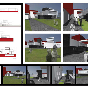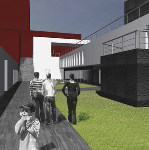 La forma e l’orientamento dell’edificio garantiscono le migliori condizioni ambientali per l’istruzione, prestazioni ottimali di illuminazione naturale per le aule (dimensionate in base alla normativa vigente), con una capacità massima per ciascuna di 25 alunni. L’edificio a sud si sviluppa in cinque livelli due dei quali a quota -9,00me -6,00 ospitano i posteggi. Si raccorda con la quota-3,00m, a limite sud del lotto con un ulteriore spazio aperto di aggregazione al quale si accede dalla quota -6,00m attraverso una gradonata e dalla quota 0,00m a mezzo di elementi di collegamento verticale presenti all’interno della struttura definita “portale”. Tale struttura ospita ai livelli -3,00m e 0,00m l’asilo nido, mentre il piano a quota +4,00m ospita una sala polifunzionale che si apre al paesaggio sottostante a mezzo di una vetrata continua posta su uno spazio aggettante. L’edificio a nord, la cui realizzazione è stata pensata attuabile in una seconda fase per garantire le operazioni di esproprio in maniera più elastica, serve per le attività libere collegate alla fruizione degli spazi dei giardini tematici adiacenti.
