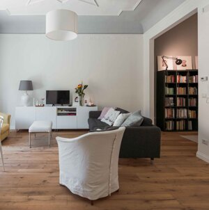 La committenza richiedeva un ampio spazio living, una camera da letto, uno studio, un bagno.