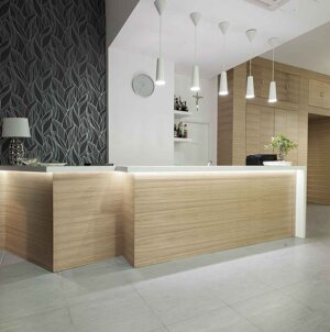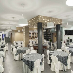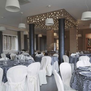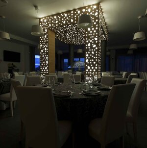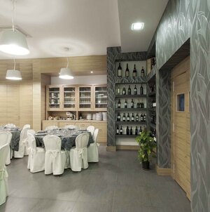 Starting from the entrance, three basic elements, made of oak wood, mark the spaces: the reception desk, which with its shapes and different directions welcomes and accompanies the client towards the hall; the system that creates an "equipped wall" formed by the wardrobe, the entrance communicating with the hotel, the mobile table clears, the niches for the wines and the entrance to the kitchens; the element "central lamp" that characterizes the space of the hall.